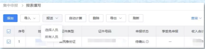 系統(tǒng)支持選擇部分人員和所有人員進(jìn)行報(bào)送,選擇“所有人員”時(shí),系統(tǒng)會將單位下申報(bào)狀態(tài)為“待報(bào)送”的人員申報(bào)表全部報(bào)送,操作前,請確認(rèn)所有“待報(bào)送”狀態(tài)的申報(bào)表都已填寫無誤。