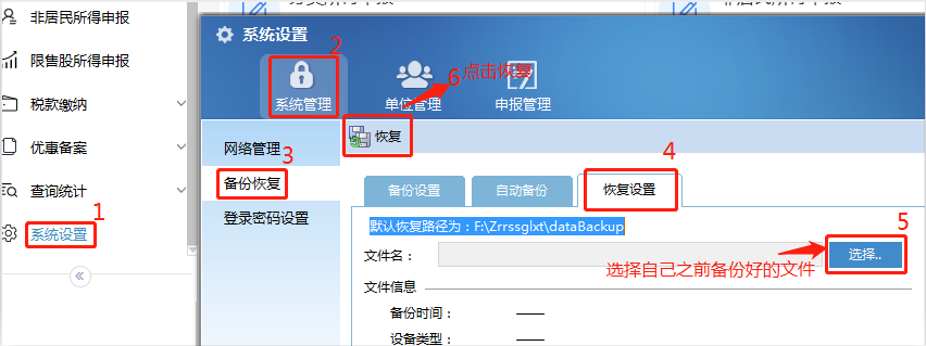 4、恢復(fù)數(shù)據(jù)(需注意要恢復(fù)的軟件里沒有任何數(shù)據(jù)才可恢復(fù),否則會(huì)覆蓋已有數(shù)據(jù)),可點(diǎn)擊查看:個(gè)稅軟件中數(shù)據(jù)如何恢復(fù)。