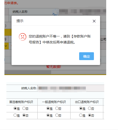 如果您出現(xiàn)以下提示,說明您將【存款賬戶賬號報(bào)告】中的【一般退稅標(biāo)識】選擇了多個銀行賬戶,但此標(biāo)識只能是唯一的,所以您需要按照提示操作,只保留一個退稅賬戶。