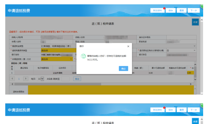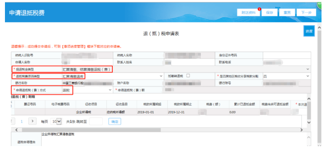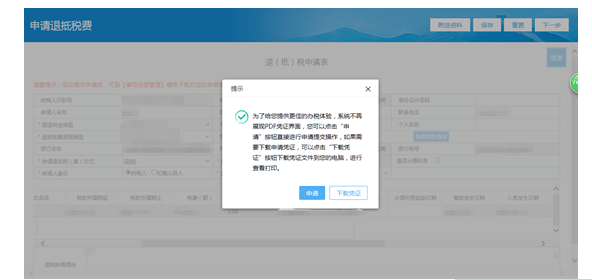 進(jìn)入退(抵)稅申請表后,錄入提退稅金類型、退抵稅費(fèi)原因類型、申請退抵稅(費(fèi))方式、本次退抵稅額、退稅申請理由等內(nèi)容,點(diǎn)擊【附送資料】,上傳必報(bào)資料,依次點(diǎn)擊【保存】、【下一步】。