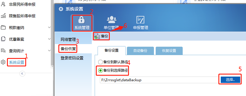 先打開要備份數(shù)據(jù)的軟件,點擊左側(cè)系統(tǒng)設(shè)置→→系統(tǒng)管理→→備份恢復→→備份設(shè)置→→備份到選擇路徑→→選擇自己備份的位置→→備份即可。