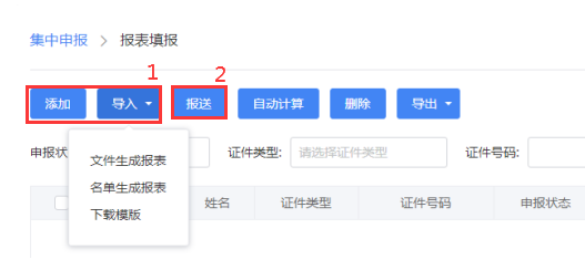 2、報表填寫報送:可直接添加或用模板導(dǎo)入,核對數(shù)據(jù)無誤后點擊“報送”;