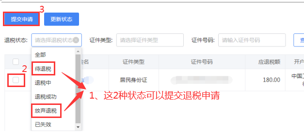 3、退稅申請:退稅狀態(tài)為“待退稅”和“放棄退稅”的可以提交退稅申請;