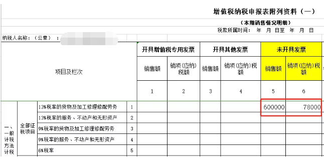 【舉例1】:甲企業(yè)為增值稅一般納稅人,按月申報,2020年7月份取得銷售智能存儲柜不含稅收入600000元,稅額78000元,當(dāng)時購買方乙公司聲稱不需要開票,申報增值稅納稅納稅申報表時,”未開具發(fā)票“已填寫了上述銷售額600000元和銷項(xiàng)稅額78000元,如下圖: