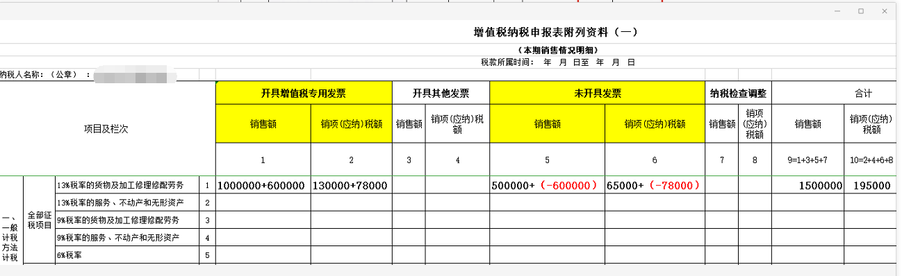 假設(shè)10月份甲公司共銷售智能存儲柜不含稅金額150萬元,銷項(xiàng)稅額195000元,其中,有100萬元開了專票,剩余50萬元未開發(fā)票,同時,乙公司又要求甲公司補(bǔ)開7月份的發(fā)票,甲公司在申報10月份的增值稅申報表時,填報數(shù)據(jù)如下: