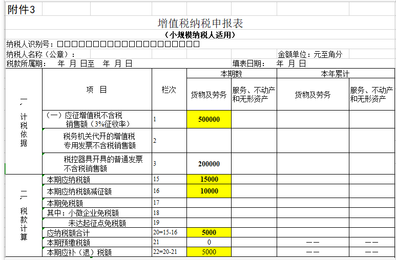 由于小規(guī)模納稅人是沒有專門的欄次填寫未開票收入,所以在實(shí)際申報過程中,將A公司的30萬的未開票收入和當(dāng)月的開票收入一起填寫在第一欄“貨物及勞務(wù)處”(為50萬元),第2、3欄是第一欄包含的內(nèi)容,是其中項(xiàng),根據(jù)實(shí)際開票情況填列,第三欄填寫開普票的收入金額20萬元。(如果這50萬元都是未開票收入,只填寫第一欄50萬元,第二、第三欄不填)