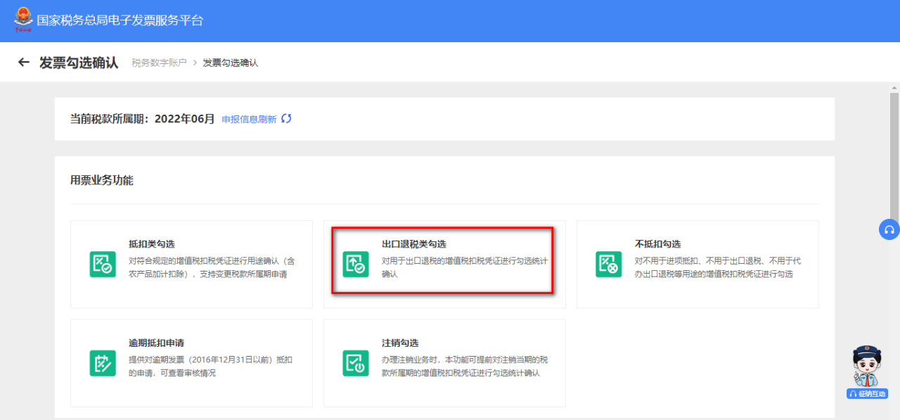 第一步:咱們還是通過【稅務數(shù)字賬戶】-【發(fā)票勾選確認】,選擇【出口退稅類勾選】進入系統(tǒng)。