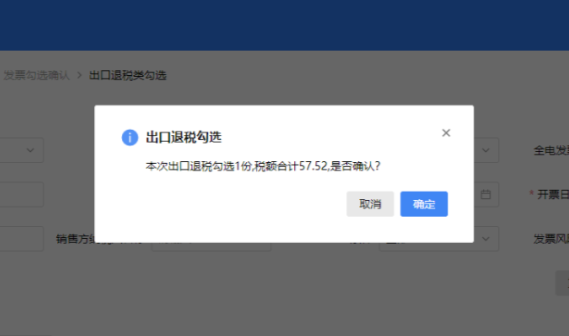 第二步:根據(jù)需要輸入或選擇相關查詢條件,點擊【查詢】,系統(tǒng)根據(jù)查詢條件,在操作區(qū)以列表形式展示符合條件的發(fā)票信息。勾選發(fā)票后,點擊【提交勾選】按鈕,系統(tǒng)會進行提示確認,如“本次出口退稅勾選1份,稅額合計57.52,是否確認?”。