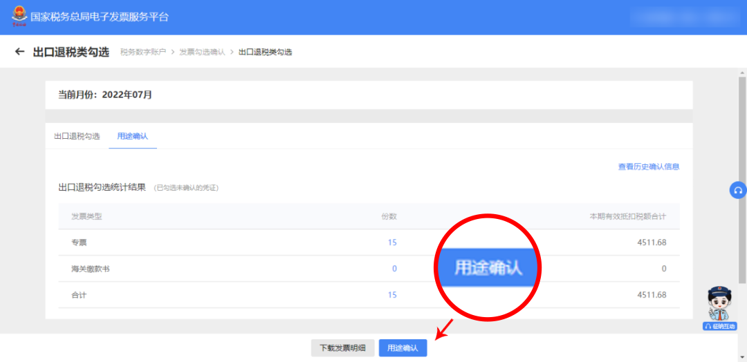 第三步:尤為關鍵,您得對已勾選確認的發(fā)票進行用途確認操作。
