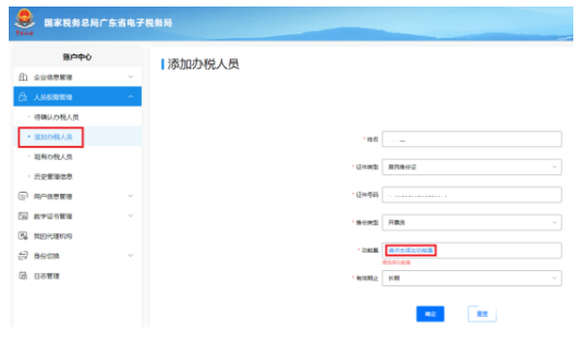 3.點擊【添加辦稅人員】,錄入開票員身份信息,選擇功能集。