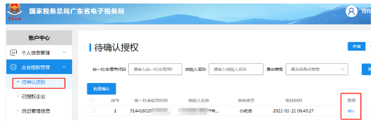 5.開票員登錄廣東省電子稅務局賬戶中心,選擇【企業(yè)授權管理】-【待確認授權】,找到待確認的授權任務,點擊確認,完成授權確認。