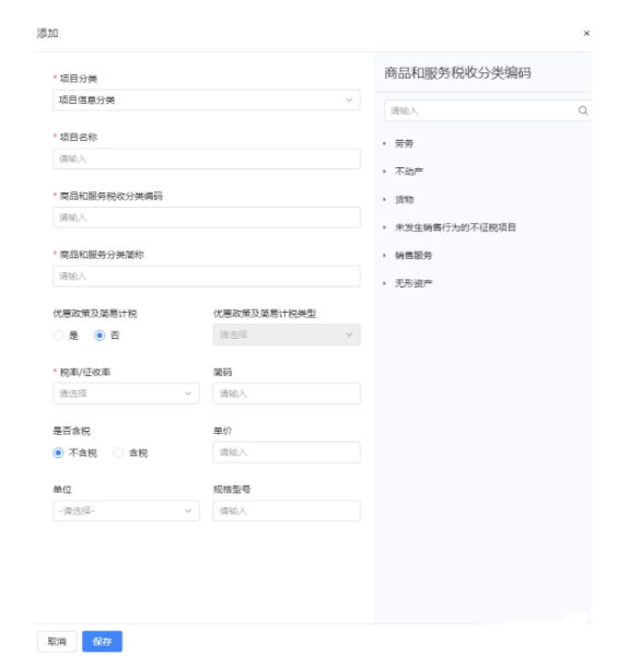 5.可在彈出的界面添加開票項目信息,包括項目名稱、稅收分類編碼、稅率、單位、單價和規(guī)格型號等信息,確認無誤后點擊【保存】。
