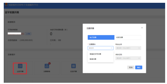 9.在【藍字發(fā)票開具】界面,點擊立即開票,選擇需要開具的發(fā)票票種、特定業(yè)務等信息,點擊【確定】。