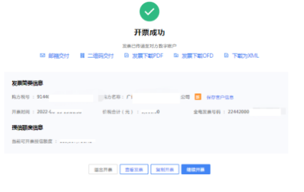 11.出現“開票成功”提示,可選擇交付發(fā)票、下載發(fā)票、查看發(fā)票以及繼續(xù)開票等功能。