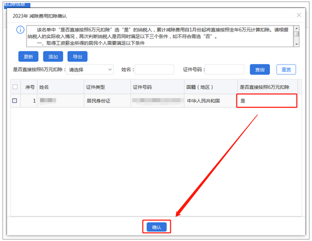 2.點擊【更新】,系統(tǒng)自動帶出符合條件的員工,是否直接按照6萬元扣除選擇“是”,點擊確認。