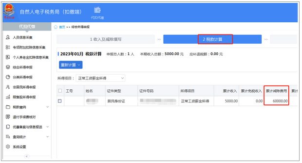 3.在收入及減除填寫完畢后,點擊【2.稅款計算】,即可查看到該員工累計減除費用直接變成了60000。