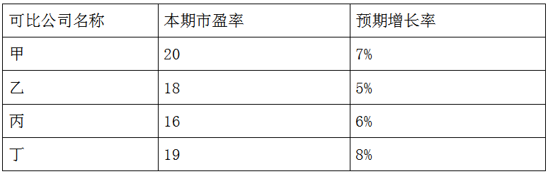 A公司是一家制造醫(yī)療設(shè)備的上市公司,每股收益是2.6元,預(yù)期增長(zhǎng)率是6%,為了評(píng)估A公司的股票價(jià)值,投資者收集了以下4個(gè)可比公司的有關(guān)數(shù)據(jù)