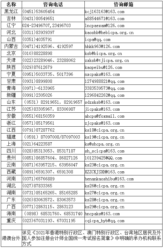 一、2021年注冊會計師考試報名期間各地咨詢電話及郵箱