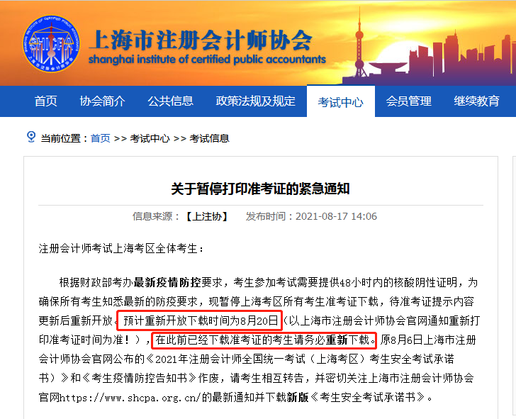 緊急通知!上海市2021年注冊會計(jì)師考試準(zhǔn)考證暫停打印