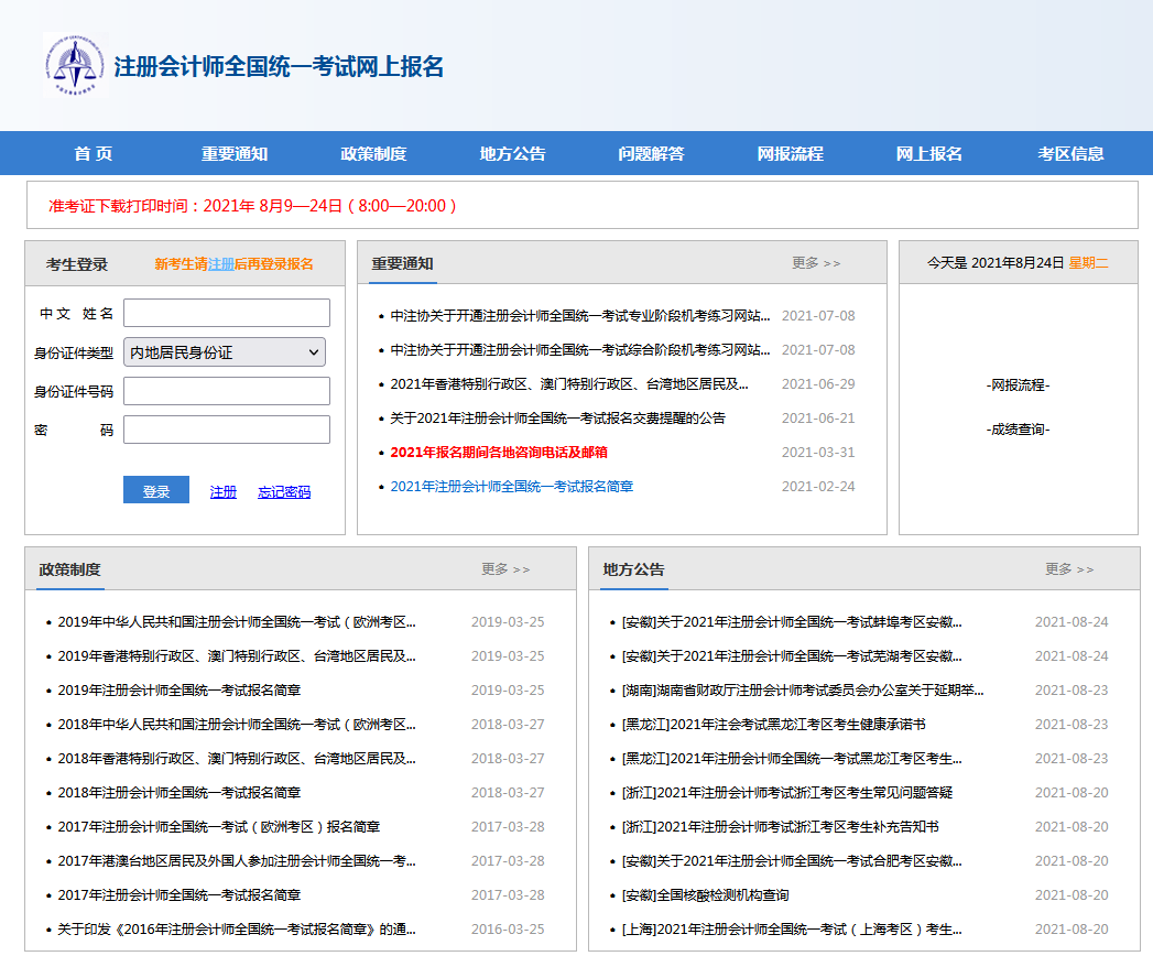 1.2021年注冊會計師考試準(zhǔn)考證打印截止時間延長至8月26日(每天8:00-20:00),請及時辦理;原定準(zhǔn)考證打印截止時間為2021年8月24日(每天8:00-20:00),因此截止時間往后延遲了兩天,請各位考生注意時間。