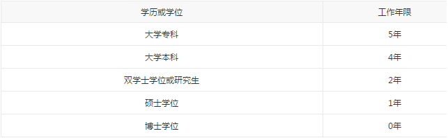 中級(jí)資格報(bào)名參加中級(jí)資格考試的人員,除具備基本條件外,還應(yīng)具備下列條件之一:(1)取得大學(xué)??茖W(xué)歷,從事會(huì)計(jì)工作滿5年;(2)取得大學(xué)本科學(xué)歷,從事會(huì)計(jì)工作滿4年;(3)取得雙學(xué)士學(xué)位或研究生班畢業(yè),從事會(huì)計(jì)工作滿2年;(4)取得碩士學(xué)位從事會(huì)計(jì)工作滿1年;(5)取得博士學(xué)位。如表格所示: